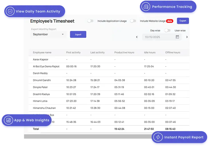 View every employee's day first activity, last activity, productive, idle & offline hours. Toggle between App or Website usage.