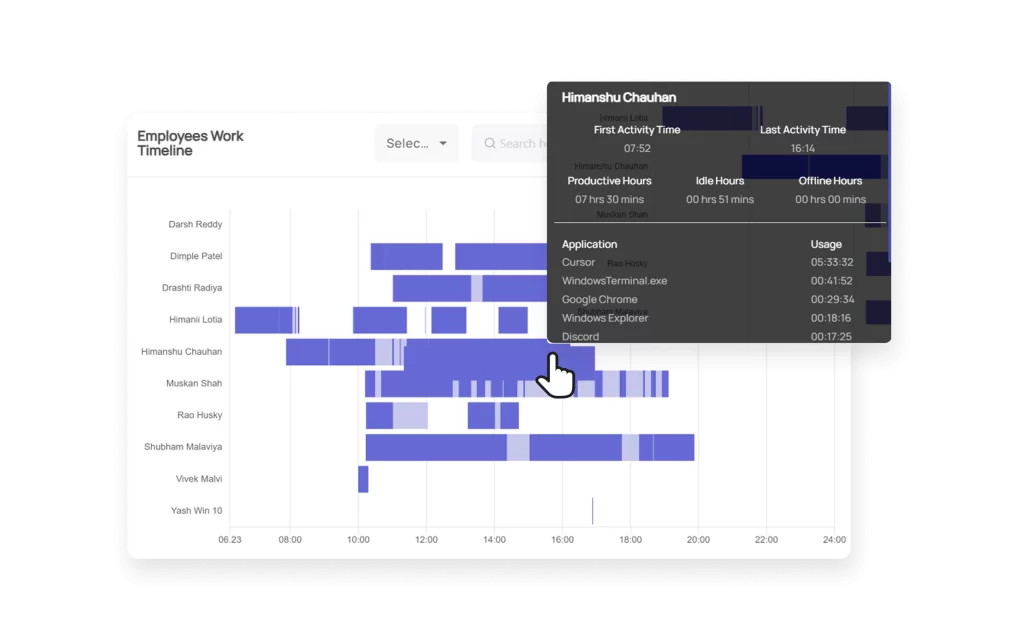 See any individual's activity across custom date ranges. Identify trends, workload, and time spent productively.